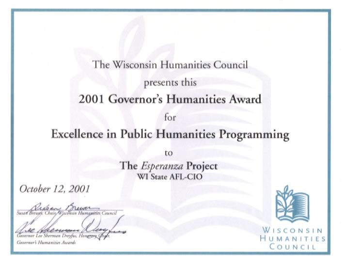 On October 12, 2001, “The Esperanza Project” was awarded the Governor's Humanities Award for Excellence in Public Humanities Programming. The award read: “The ‘Esperanza’ Project, led by Karlos Moser, was a multi-faceted arts and humanities project centered on the writing and production of a new American opera, “Esperanza”. The opera is based on a true story of Mexican American workers in New Mexico, and is drawn from the film “Salt of the Earth”. The opera and its surrounding activities prompted interaction among history enthusiasts, opera buffs, Latino/a activists, women's history specialists, union members, and a large public audience that was unusually diverse in class and ethnicity.”